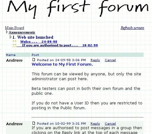 You are here: irt.org | Articles | Database | My First Forum - a bulletin board application [ previous next ]