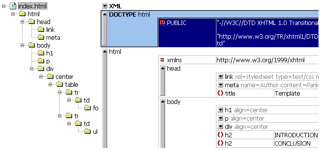 XML Spy is a commercial XML editor with support for XHTML 1.0, that provides three advanced views of the documents: an Enhanced Grid View for structured editing, a Source View with syntax-coloring for low-level work, and an integrated Browser View. An example illustration of the Enhanced Grid View is available.