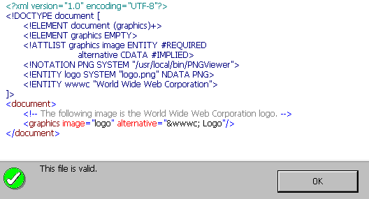 C:\XML\XML4C\bin>SAXPrint.exe -v wwwc_logo.xml <document> <graphics image="logo" alternative="World Wide Web Corporation Logo"></graphics> </document>