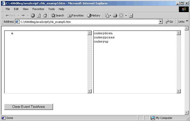 Within a form called form1 in the body of the page, we define two textareas and a button. The first textarea is the one whose events we are going to monitor. We attach code which calls the DisplayEvent() function to each of the onchange, onkeydown, onkeypress, and onkeyup event handlers. The value passed to the function reflects the name of the event firing.