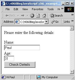 }When the onchange event fires, when focus is passed away form the name text box and its contents have changed, we take the value of the txtName box and put it into the window's status bar at the bottom of the window. It simply says Hi yourname. We access the status bar using the window object's status property. Although we could just put: